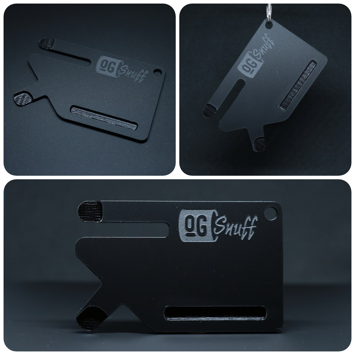 The OG Snuff Card features two scoops of different lengths and shapes, designed to help extract your product from a tin, a box, or a plastic baggy. Engraved in the card is also a sniffing groove for direct pouring.